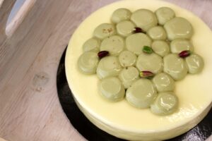 Biscuit al pistacchio, cioccolato Gold, cremoso al pistacchio, mousse al limone e ganache al pistacchio