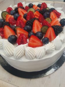 pan di spagna con bagna al limone, crema chantilly, panna montata e frutta fresca